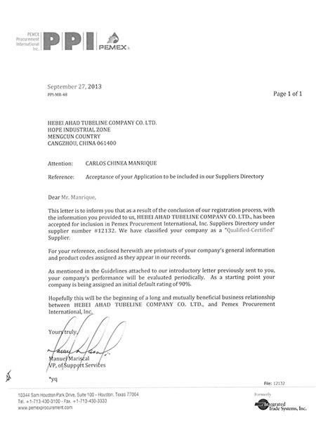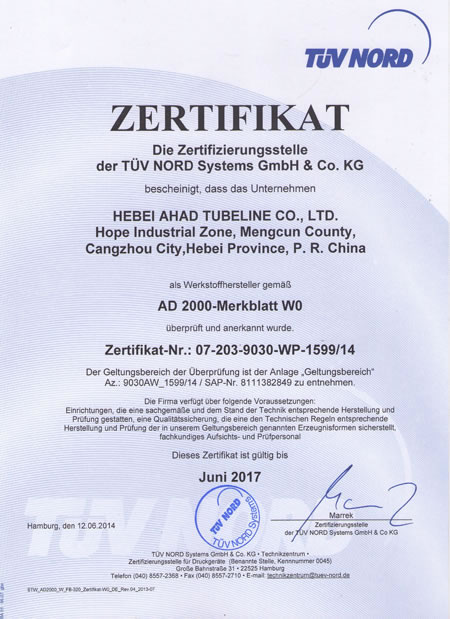 Ahad는 중국에서 산업용 파이프 이음및 부속품을 생산하는 전문업체로서 산업표준을 준수하며 각종 국제 공인기관으로부터 품질인증서를 획득하여 고객의 신뢰도와 품질의 향상을 위해 노력을 하고있습니다. 이러한 제품들은ISO 9001, PED, AD2000, API, ISO/TS29001, OHSAS18001, ISO14001, Q-SY1002.1 관리시스템에 따라 제조되고 , 발전, 석유, 천연가스, 화학, 조선, 남방, 제지, 야금 등과 같은 산업에서 널리 사용됩니다. 그들은 미국, 이탈리아, 벨기에, 칠레, 볼리비아, 아랍 에미리트 연합국, 브라질, 한국, 스페인, 이란, 터키등 많은 나라에서 사용됩니다. 당사가 NIGC, PETROBRASALC PEMEX사의 전문 공급업체로 되었습니다.